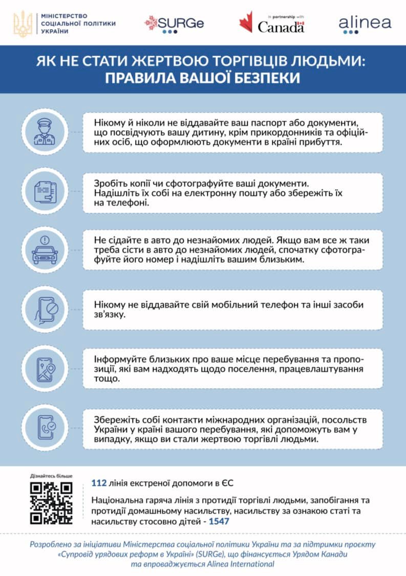 Що потрібно зробити, якщо ви потрапили у ситуацію торгівлі людьми або є свідком такої ситуації після перетину державного кордону? – відповіді на ці та інші важливі запитання щодо убезпечення себе та близьких від ситуацій торгівлі людьми ви знайдете за посиланням https://safewomen.com.ua/
