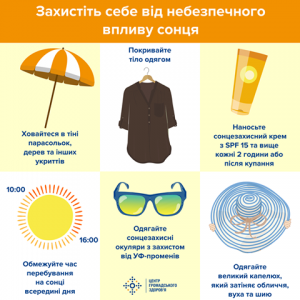 - Як найменше перебувати під прямими сонячними променями. Та якщо це неминуче, то захищайте голову капелюхами і парасольками.